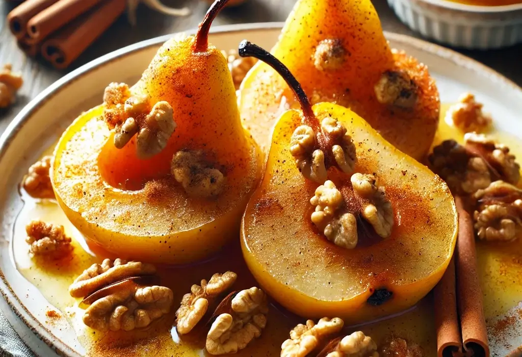 - Espolvorear la mezcla de canela y nueces sobre las peras.